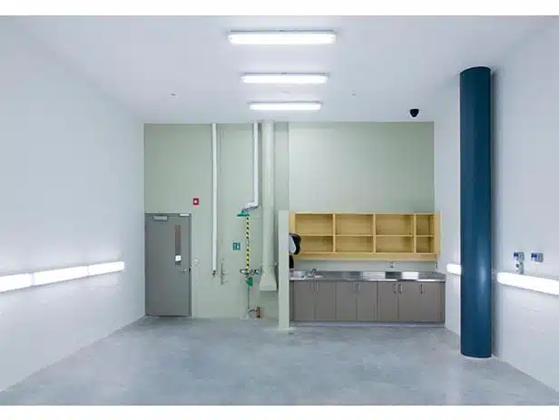This facility encompasses several Vancouver Police Department (VPD) divisions: Property and Evidence, Property and Forensic Vehicle Examination, and Information Management. Property and evidence storage is designed to accommodate all possible forms of evidence, including DNA samples, drugs, and firearms. Freezer rooms and climate controls protect the evidence from deterioration. A blood drying room, used to allow bloody or wet evidence to stabilize before being stored as evidence, contains a specialized fridge for insects. The building is home to Canada’s largest rotating bike rack, which stores stolen bikes as evidence. The rack runs on a conveyor system and stores the bikes at ceiling height, freeing up valuable floor space for other uses.