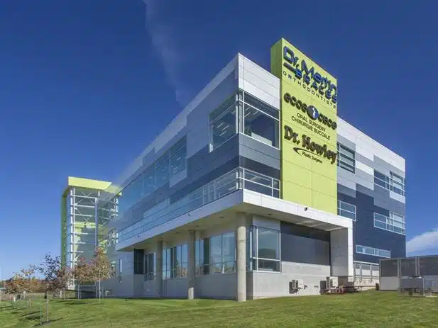 This 52,000 sq. ft. medical centre concept began with a three storey ‘rectangular box’ maximizing frontage on Mapleton Road and views to the adjacent nature park. By shearing the ‘box’ into two parts along the same perpendicular axis with an east-west atrium, a spine was created for the public arrival space and internal circulation. Natural light penetrates to the heart of the building. The spine, expressed on the building’s exterior as a cantilevered volume floating above grade on the park side, is a distinctive design element, and is further enhanced by its bold lime-yellow colours (1st time these colours were used in Canada)and glazed end walls. The aesthetic approach is carried over into the bright and inviting interior, where elevated walkways crossing the atrium at each floor animate the space. Three meter high glass panels in a top floor Orthodonic Clinic permit serene views of the adjacent nature park. The building’s design, referred to in the community simply as ‘585’, has become a distinctive landmark at one of the city’s more prominent gateways. This 4-storey building with a 3-storey atrium included lighting design heavily utilized to influence the unique aesthetic of the building.