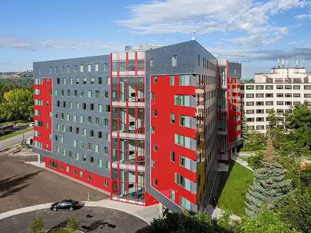 These two new residences on the University of Calgary campus were built using the Design-Build method. Aurora Hall is constructed in a triangular and pinwheel configuration. This nine story structure provides the campus with 268 beds. Crowsnest Hall features to towers, one 7 stories and the other 11 stories joined by a common main floor. This structure offers an addtitional 390 beds to student housing on campus. Both buildings feature shared lounges, social and study spaces.